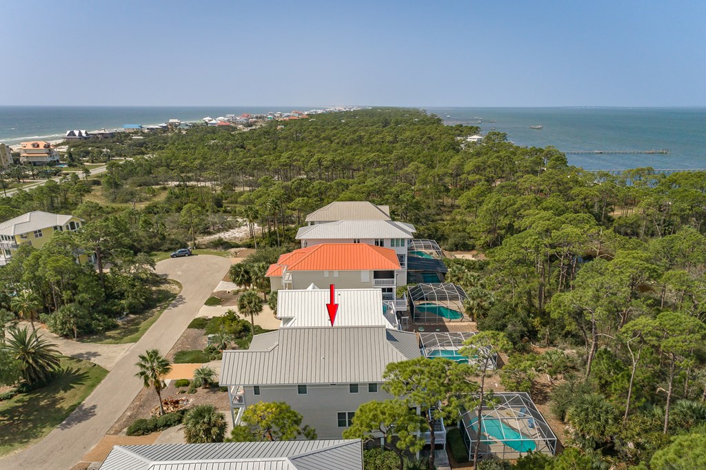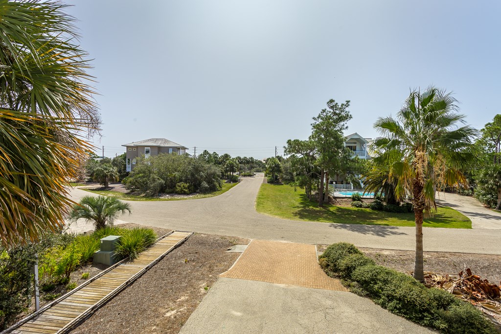 Head east on East Gulf Beach Drive, turn left into subdivision and home is directly at end of road.