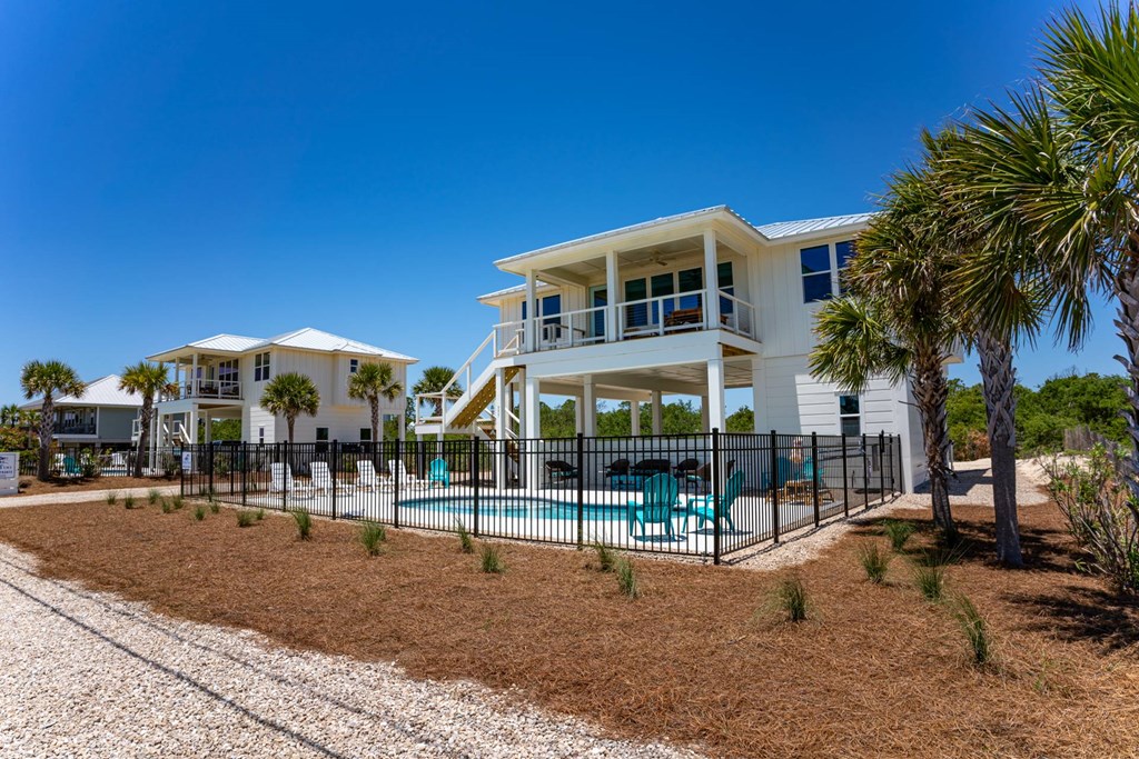 Offering the rare advantage of a higher elevation lot and more affordable insurance, Little Kokomo combines established rental income, Gulf views, and turnkey condition—a standout investment opportunity on St. George Island. Built in 2020, this 4-bedroom, 3-bath home is designed for both performance and comfort, featuring an open-concept layout, quartz countertops, stainless appliances, and a spacious living area that flows onto a covered deck overlooking the private, fully fenced pool. Recent upgrades enhance both guest experience and owner value, including new LVP flooring (2024), a HeatPro heat & cool pool system (Sept 2025) for extended rental seasons, and new Polywood outdoor furnishings. The primary suite features a double vanity and tiled walk-in shower, while three additional bedrooms—one being a custom bunkroom—maximize rental flexibility. The ground level recreation room adds a 3rd full bath and 450 sq ft of H/C sq ft for a total of 2033 H/C sq ft. Located near island dining, shopping, and beach access, this property is ideally positioned to capture strong rental demand. 2025 GRI: $81,599 with continued upside potential. Turnkey, income-producing, and ready for immediate occupancy or rental continuation.