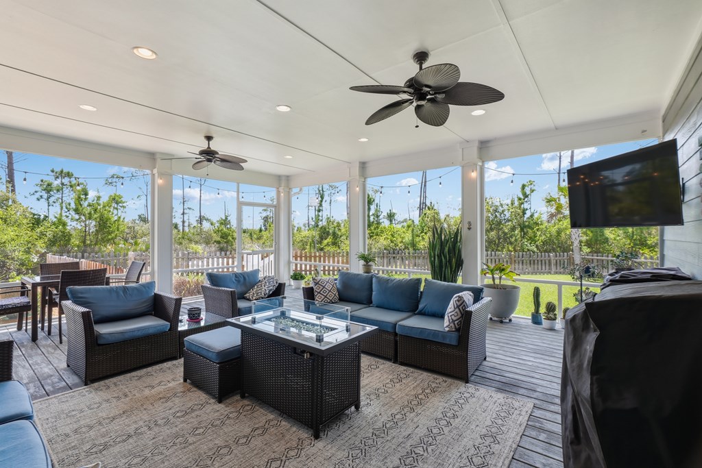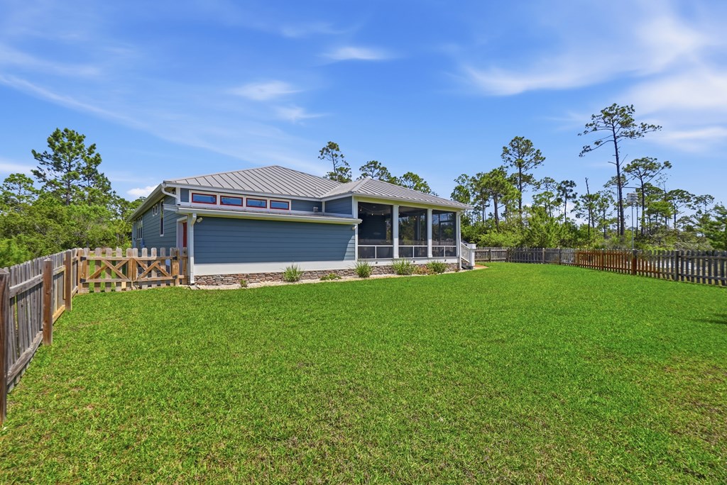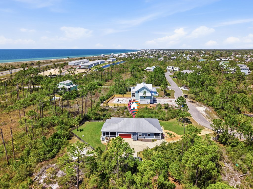 Enjoy coastal breezes from the covered front porch or unwind on the oversized screened-in patio of this beautifully designed coastal retreat at Sunset Village. Perfectly positioned on a generously sized homesite just minutes from Mexico Beach and a short stroll or golf cart ride to a county-maintained beach access, this home offers the ideal blend of relaxed Gulf Coast living and refined comfort. Spanning over 2,000 square feet, this single-story residence features a thoughtfully designed open floor plan with three bedrooms and two and a half baths. The inviting main living area is anchored by a cozy fireplace and filled with natural light, flowing seamlessly into the dining space and a custom kitchen designed for both style and function. The well-appointed kitchen boasts a spacious breakfast bar and island, double pantry, custom cabinetry, and granite countertops, perfect for everyday living and entertaining alike. The split floor plan provides privacy and flexibility, with two bedrooms and a bath and a half on the easterly side of the home, while the primary suite is tucked away on the westerly end. The primary retreat features a walk-in closet, ensuite bath, and direct access to a private covered and screened-in patio, an ideal space for outdoor entertaining or quiet relaxation. You will also love the library nook for reflection. A double garage and separate golf cart garage offers many storage options. Outside, the expansive and irrigated property provides both privacy and room to enjoy the natural surroundings, with a fenced back yard and open natural spaces for enjoying the coastal breezes. Located just five minutes from Mexico Beach and five miles from the charm of Port St. Joe, Sunset Village offers a peaceful setting with convenient access to white-sand beaches, boating, dining, and the laid-back lifestyle of Florida's Forgotten Coast. Flood Ins-$984, Wind/Fire-$1865. Some dimensions obtained from the Gulf PA site please verify if important.
