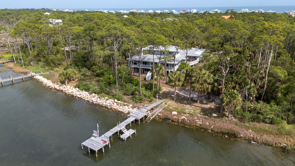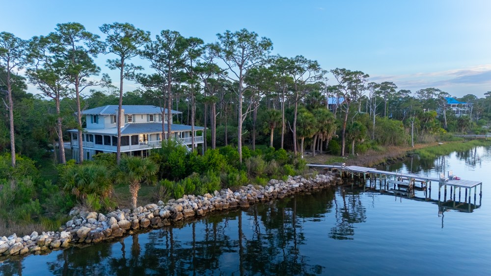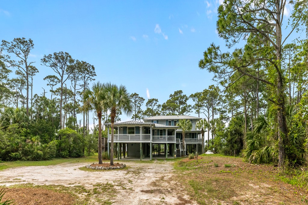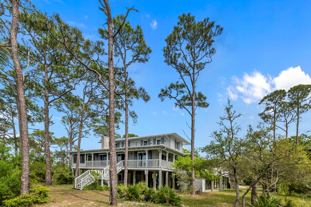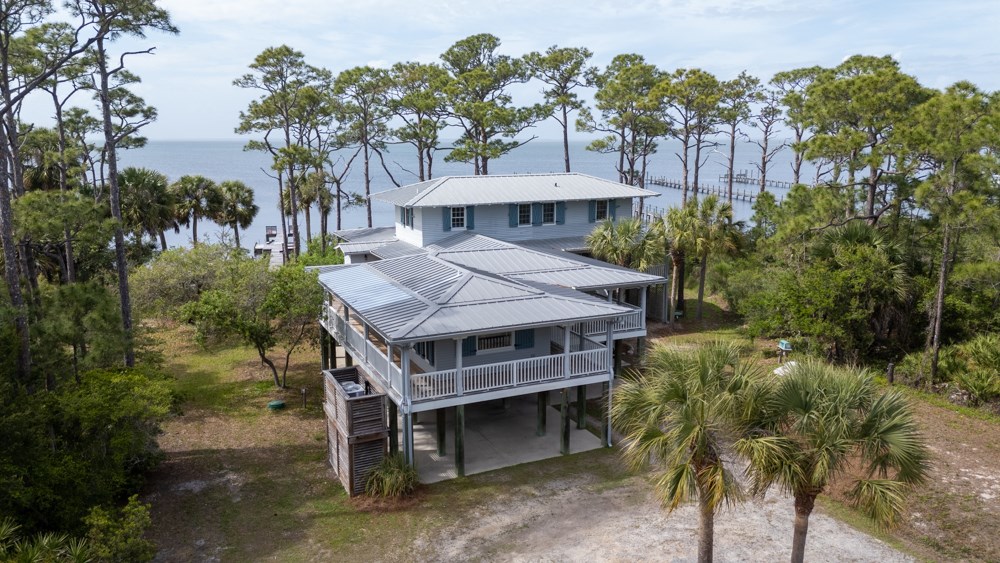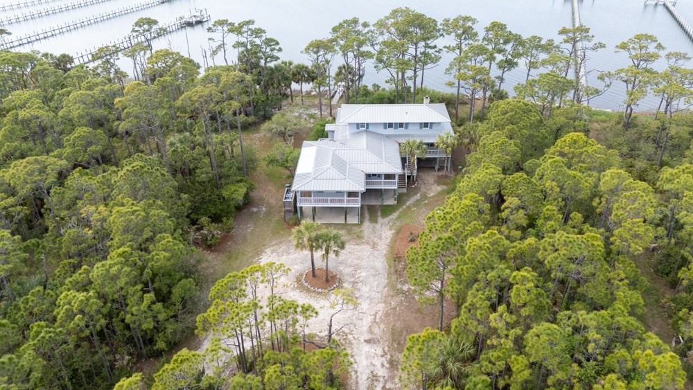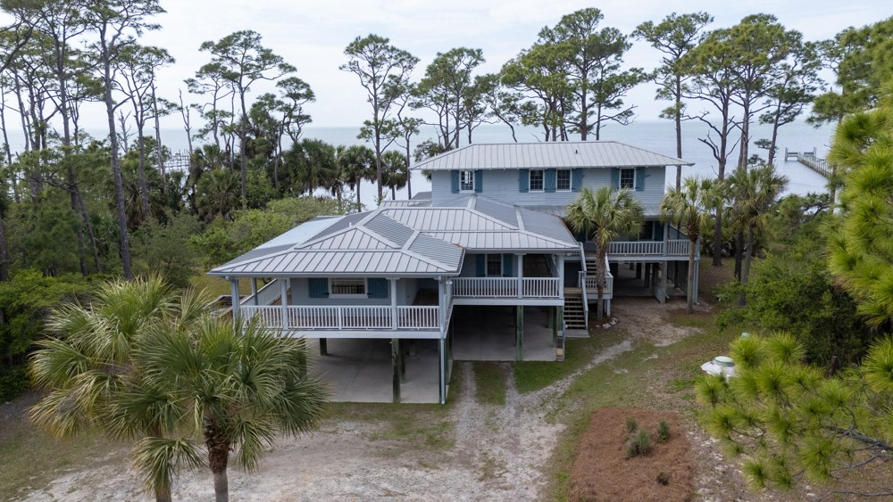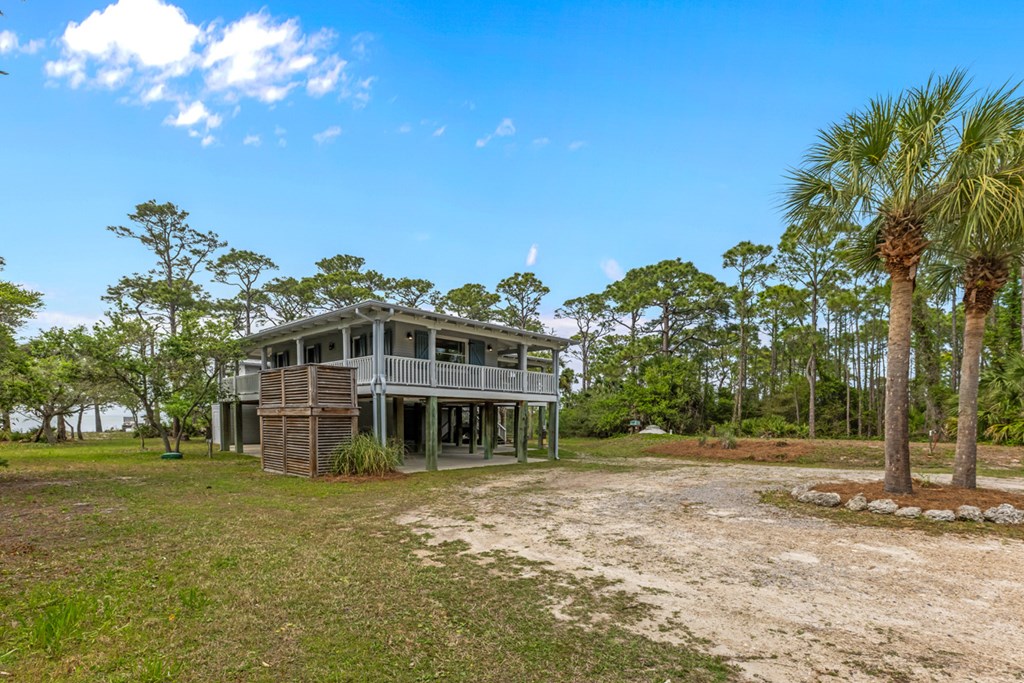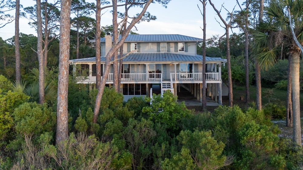 Welcome to a true bayfront retreat where Old Florida charm meets effortless coastal luxury. Nestled on a private, naturally wooded acre within the coveted Plantation community, this 3,000+ square foot residence captures the essence of island living with sweeping views of the emerald bay, serene flats, and endless skies. Designed for both relaxation and entertaining, the home features two spacious living areas that offer comfort and flexibility for gathering with family and guests. The primary suite is a private sanctuary, complete with an ensuite bath, generous walk-in closets, and a large soaking tub perfect for unwinding after a day on the water. The thoughtful layout includes a lower level bedroom for convenience, while two additional bedrooms upstairs provide privacy and elevated views. Expansive wraparound porches invite you to enjoy coastal breezes, swaying palms, and ever-changing bay views. Just moments away, the pristine white sand beaches of St. George Island stretch for miles, offering some of the most untouched shoreline on the Gulf Coast. Spend your days beachcombing, boating, or simply taking in unforgettable sunsets. Inside, timeless details like a cozy fireplace and classic Florida interior shutters pair beautifully with exterior shutters that enhance both charm and function, creating a warm and refined Old Florida feel. This property is a fisherman's paradise with incredible waterfront potential and access to some of the area's best fishing. An adjacent lot is also available, offering a rare opportunity to expand your private coastal estate. Located within the Plantation, residents enjoy multiple pools, a clubhouse with exercise room, a private airstrip, and proximity to prime fishing at the cut. By boat, explore St. George Island or Apalachicola with ease. This is more than a home. It is a lifestyle defined by nature, privacy, and the beauty of the Forgotten Coast. .5% buyer fee for Plantation HOA