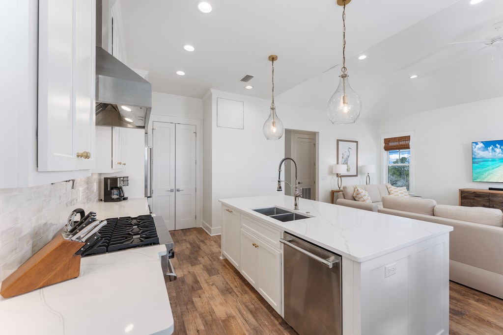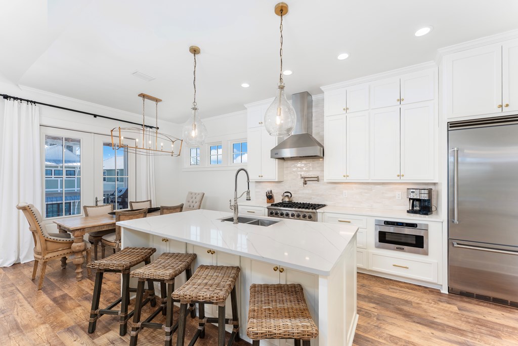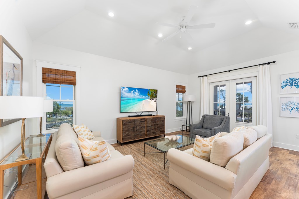 Experience the pinnacle of coastal luxury in this stunning 5-bedroom, 4.5-bath home, where every detail has been thoughtfully curated for an elevated lifestyle. Soaring 10-foot ceilings, 8-foot solid doors, and a seamless blend of recessed and custom lighting create an atmosphere of refined elegance throughout. High-quality furnishings are included, making this home truly move-in ready. The open-concept living, dining, and kitchen areas flow effortlessly onto an expansive covered deck — perfect for entertaining or simply soaking in breathtaking bay views. Anderson Windows and Therma-Tru doors flood every room with natural light while framing stunning water vistas. The Owner's Suite offers a private retreat with its own dedicated covered deck access. At the heart of the home, a chef's kitchen impresses with a large Quartz island ideal for casual gatherings, Viking gas range and refrigerator, full tile backsplash, pantry, and beautifully appointed Quartz countertops. Every bathroom is a spa-like sanctuary featuring generous walk-in showers, Quartz counters, and elegant tile flooring — with one bath offering a luxurious tub/shower combination. A three-stop elevator adds everyday convenience, while covered decks on multiple levels keep you connected to the coastal breeze. The spacious two-car garage includes an indoor shower at the back of the garage— perfect for rinsing sandy feet or bathing pets after a day at the beach. Professionally landscaped grounds complete this exceptional property. Located within the prestigious Ovation community on Cape San Blas, residents enjoy two resort-style pools (bayfront and beachside), tennis and pickleball courts, a fitness center, a fire-pit gathering area, and scenic boardwalks leading to the Gulf's sugar-white sands and pristine bay. Whether your vision is a primary residence or the ultimate vacation retreat, this is your opportunity to make lasting memories in one of Florida's most treasured coastal destinations.