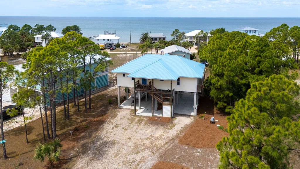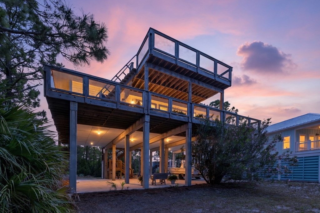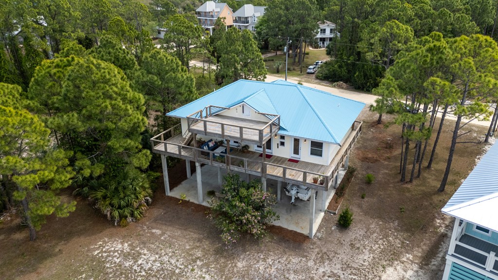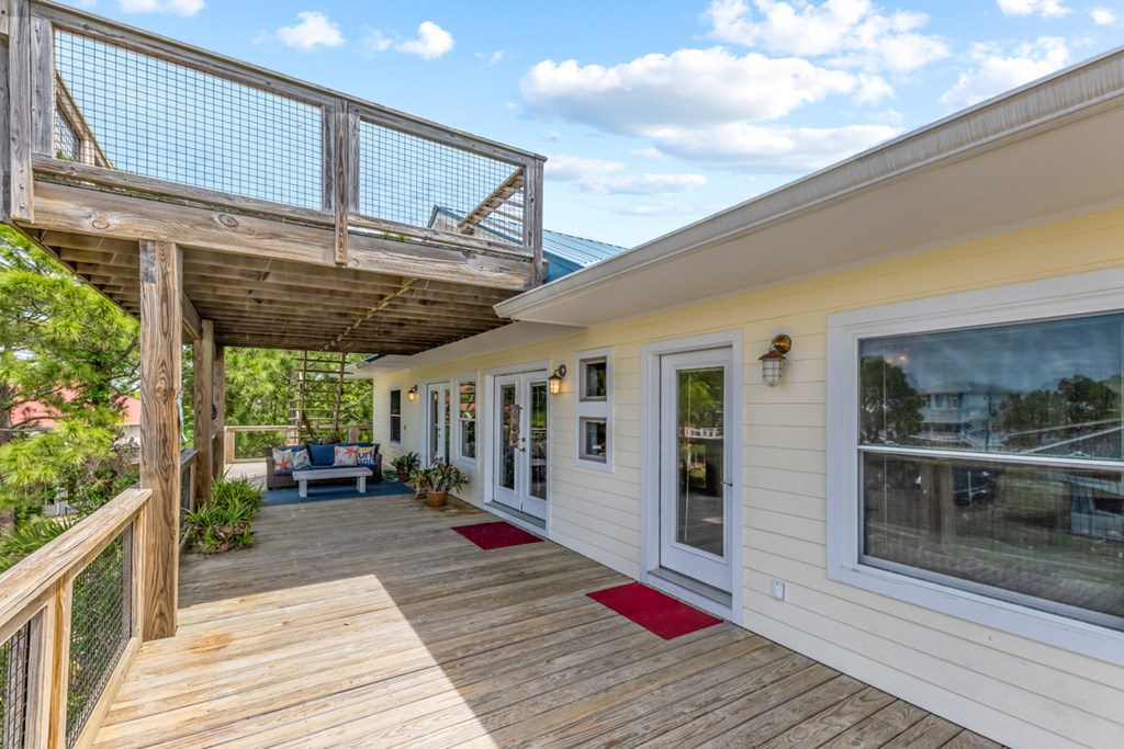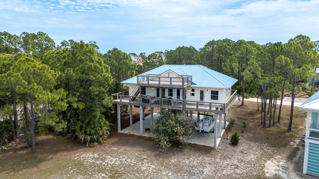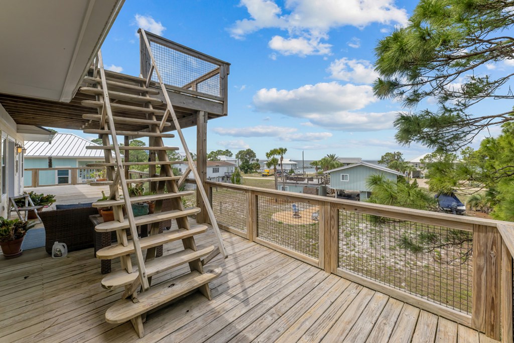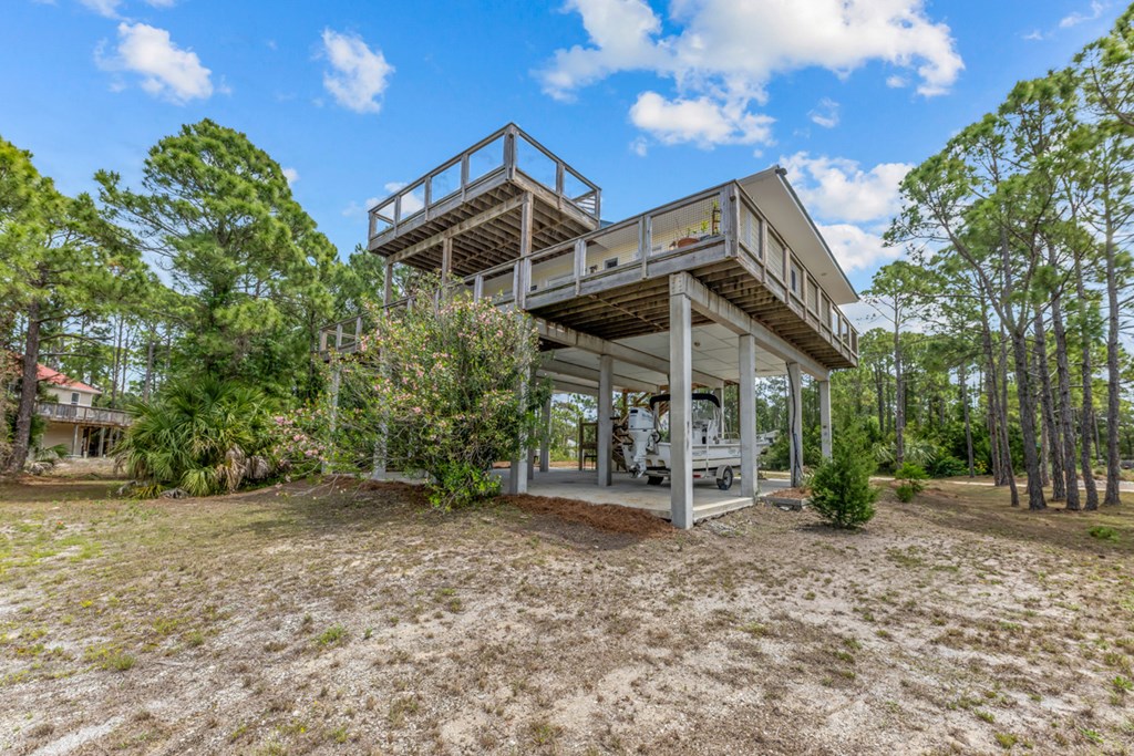 Wake up to sweeping bay views in this beautifully designed 3 bedroom, 2 bathroom coastal retreat near the heart of St. George Island, Florida. Perfectly positioned on a nice interior lot and built on cement pilings, this thoughtfully designed home captures sweeping, forever views of the Apalachicola Bay, with a top deck vantage point that stretches all the way to the Apalachicola River. Designed with both comfort and entertaining in mind, the open concept layout features high vaulted ceilings, rich bamboo flooring throughout, and a spacious breakfast bar that invites gathering. The kitchen and living areas flow seamlessly onto expansive porches where coastal breezes, glowing sunsets, and star filled skies set the tone for effortless indoor-outdoor living. Enjoy incredible water views from the crows nest and ample room for activities on the parking deck! The primary suite offers a peaceful escape with a large bedroom, walk in closet, and beautifully appointed tile shower, while two additional guest bedrooms are generously sized with ample closet space and natural light. Every detail reflects quality craftsmanship and a warm, welcoming energy. Located just moments from the beach and extremely close to the coveted, Regatta Park, this golf cart friendly neighborhood offers easy access to downtown island charm, white sand beaches, and the laid back lifestyle of the Forgotten Coast. Enjoy nearby dining, shops, and a short scenic drive to historic Apalachicola. Additional highlights include under house space tall enough to accommodate a large boat, making it ideal for those who want to fully embrace coastal living on and off the water. Whether you are searching for a full time residence, second home, or investment rental, this property delivers on location, lifestyle, and value. Priced to sell, this is a rare opportunity to own a home that truly captures the spirit and the views of the Forgotten Coast. No HOA! Offered furnished with all the island vibes!