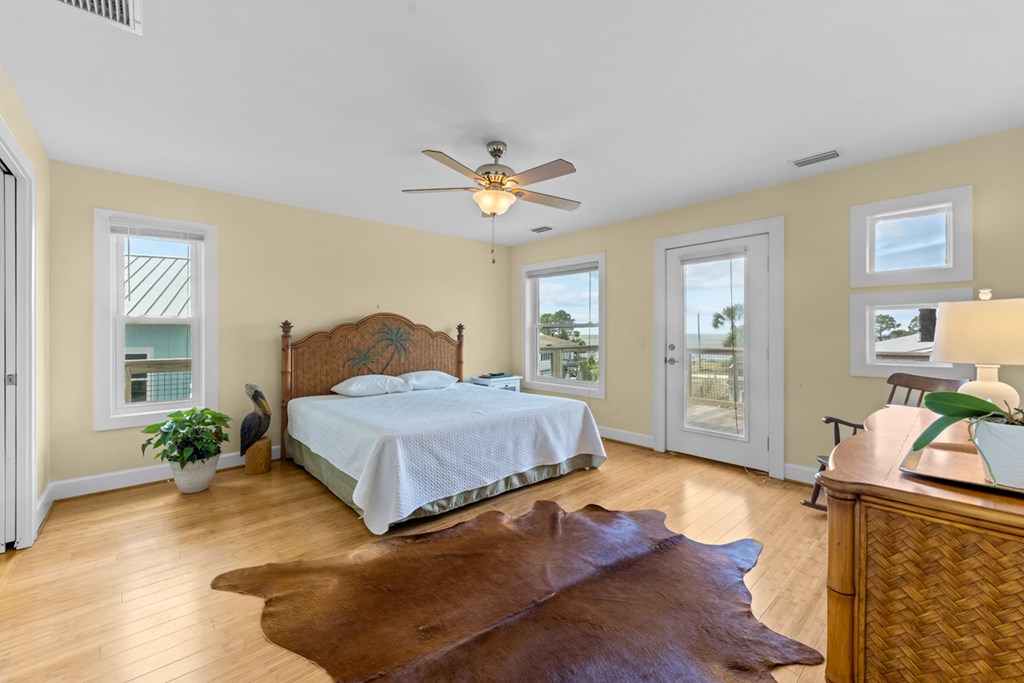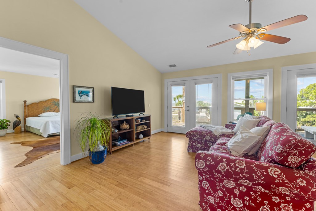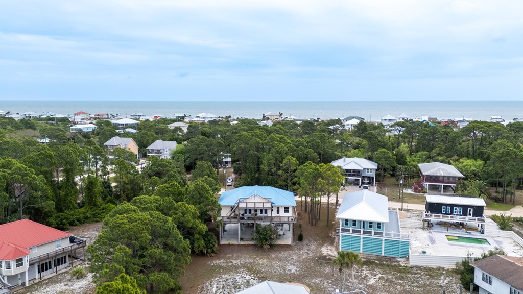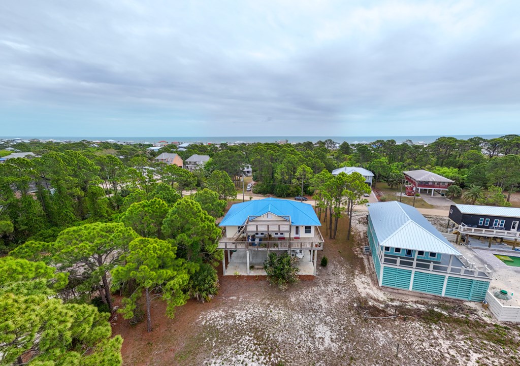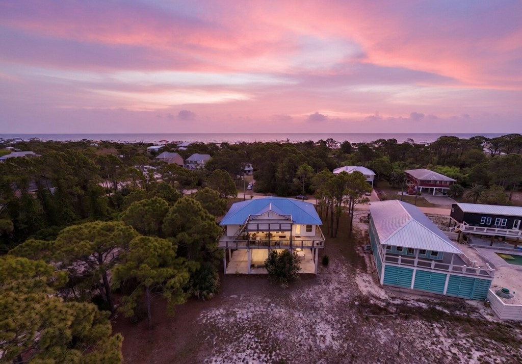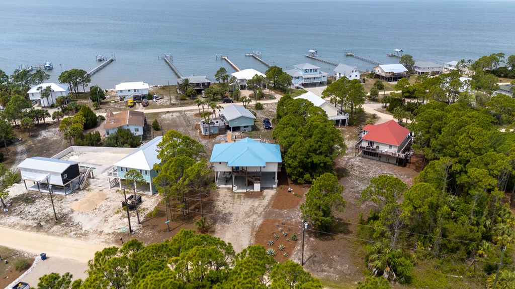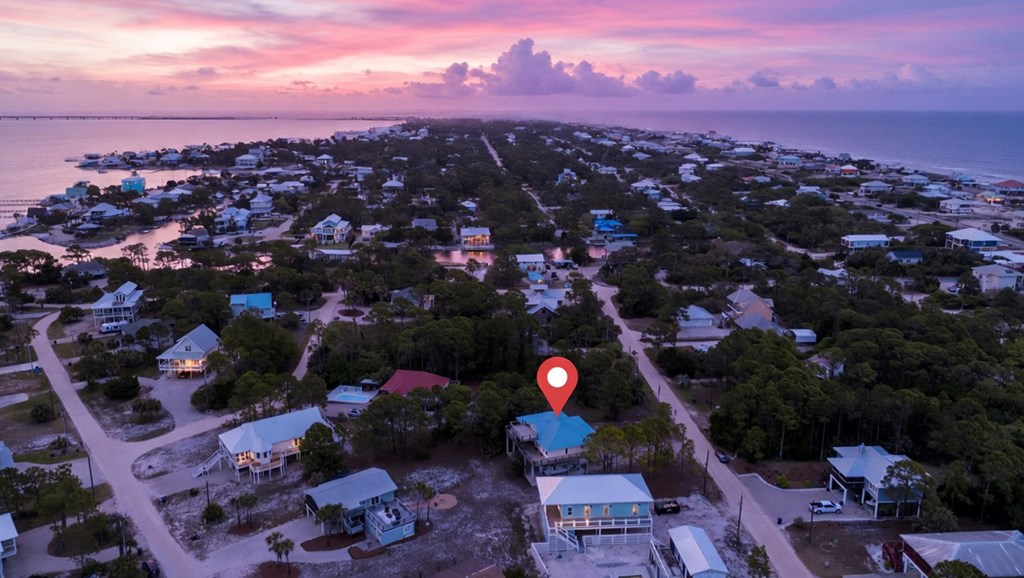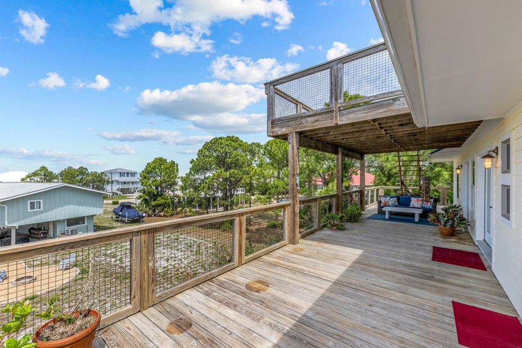 Wake up to sweeping bay views in this beautifully designed 3 bedroom, 2 bathroom coastal retreat near the heart of St. George Island, Florida. Perfectly positioned on a nice interior lot and built on cement pilings, this thoughtfully designed home captures sweeping, forever views of the Apalachicola Bay, with a top deck vantage point that stretches all the way to the Apalachicola River. Designed with both comfort and entertaining in mind, the open concept layout features high vaulted ceilings, rich bamboo flooring throughout, and a spacious breakfast bar that invites gathering. The kitchen and living areas flow seamlessly onto expansive porches where coastal breezes, glowing sunsets, and star filled skies set the tone for effortless indoor-outdoor living. Enjoy incredible water views from the crows nest and ample room for activities on the parking deck! The primary suite offers a peaceful escape with a large bedroom, walk in closet, and beautifully appointed tile shower, while two additional guest bedrooms are generously sized with ample closet space and natural light. Every detail reflects quality craftsmanship and a warm, welcoming energy. Located just moments from the beach and extremely close to the coveted, Regatta Park, this golf cart friendly neighborhood offers easy access to downtown island charm, white sand beaches, and the laid back lifestyle of the Forgotten Coast. Enjoy nearby dining, shops, and a short scenic drive to historic Apalachicola. Additional highlights include under house space tall enough to accommodate a large boat, making it ideal for those who want to fully embrace coastal living on and off the water. Whether you are searching for a full time residence, second home, or investment rental, this property delivers on location, lifestyle, and value. Priced to sell, this is a rare opportunity to own a home that truly captures the spirit and the views of the Forgotten Coast. No HOA! Offered furnished with all the island vibes!