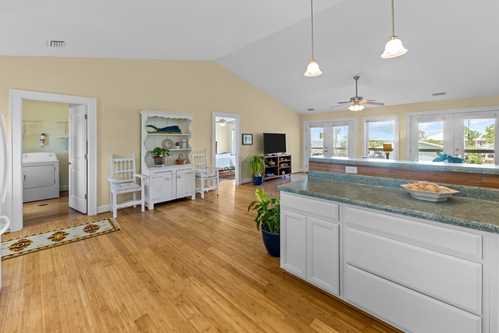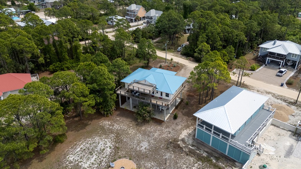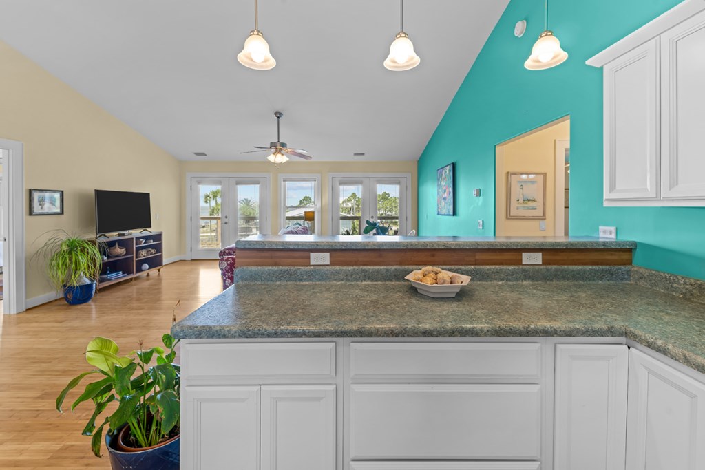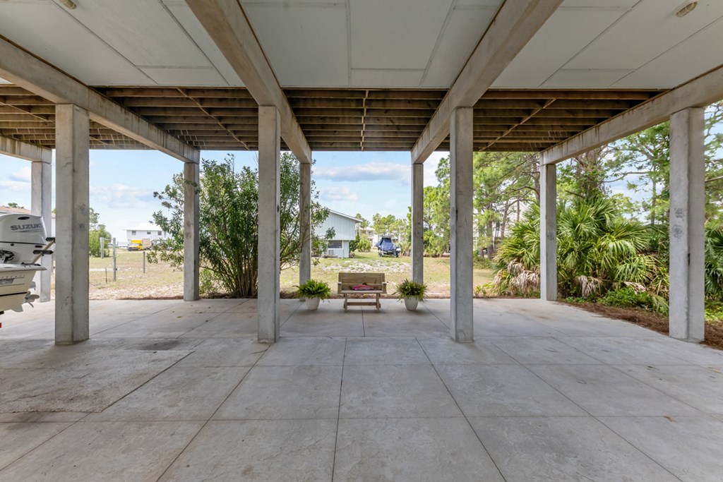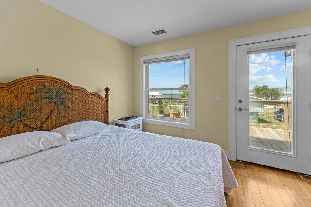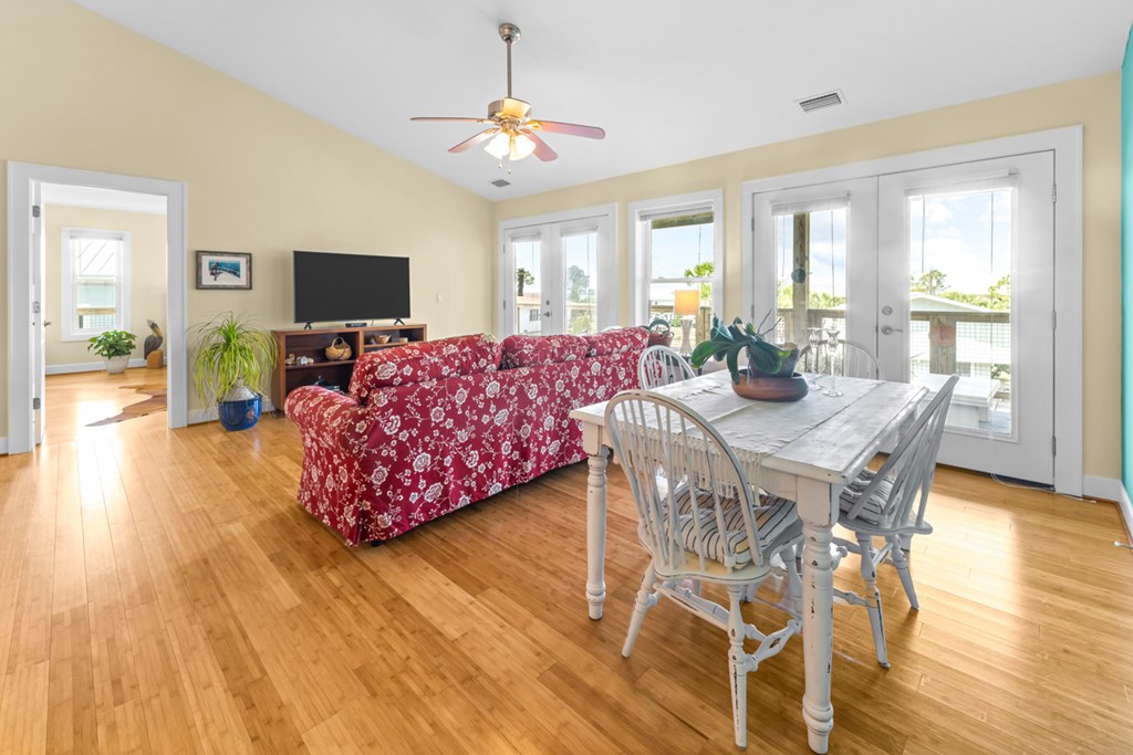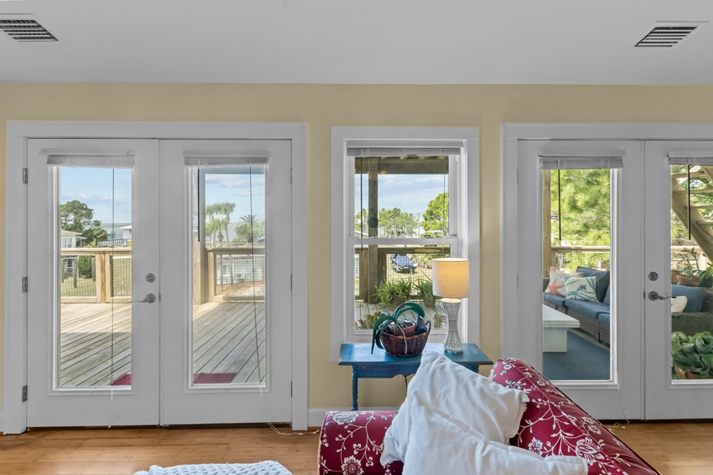Wake up to sweeping bay views in this beautifully designed 3 bedroom, 2 bathroom coastal retreat near the heart of St. George Island, Florida. Perfectly positioned on a nice interior lot and built on cement pilings, this thoughtfully designed home captures sweeping, forever views of the Apalachicola Bay, with a top deck vantage point that stretches all the way to the Apalachicola River. Designed with both comfort and entertaining in mind, the open concept layout features high vaulted ceilings, rich bamboo flooring throughout, and a spacious breakfast bar that invites gathering. The kitchen and living areas flow seamlessly onto expansive porches where coastal breezes, glowing sunsets, and star filled skies set the tone for effortless indoor-outdoor living. Enjoy incredible water views from the crows nest and ample room for activities on the parking deck! The primary suite offers a peaceful escape with a large bedroom, walk in closet, and beautifully appointed tile shower, while two additional guest bedrooms are generously sized with ample closet space and natural light. Every detail reflects quality craftsmanship and a warm, welcoming energy. Located just moments from the beach and extremely close to the coveted, Regatta Park, this golf cart friendly neighborhood offers easy access to downtown island charm, white sand beaches, and the laid back lifestyle of the Forgotten Coast. Enjoy nearby dining, shops, and a short scenic drive to historic Apalachicola. Additional highlights include under house space tall enough to accommodate a large boat, making it ideal for those who want to fully embrace coastal living on and off the water. Whether you are searching for a full time residence, second home, or investment rental, this property delivers on location, lifestyle, and value. Priced to sell, this is a rare opportunity to own a home that truly captures the spirit and the views of the Forgotten Coast. No HOA! Offered furnished with all the island vibes!