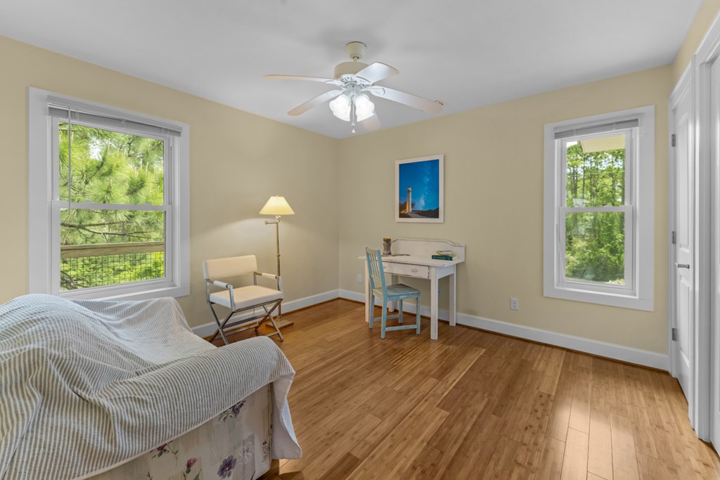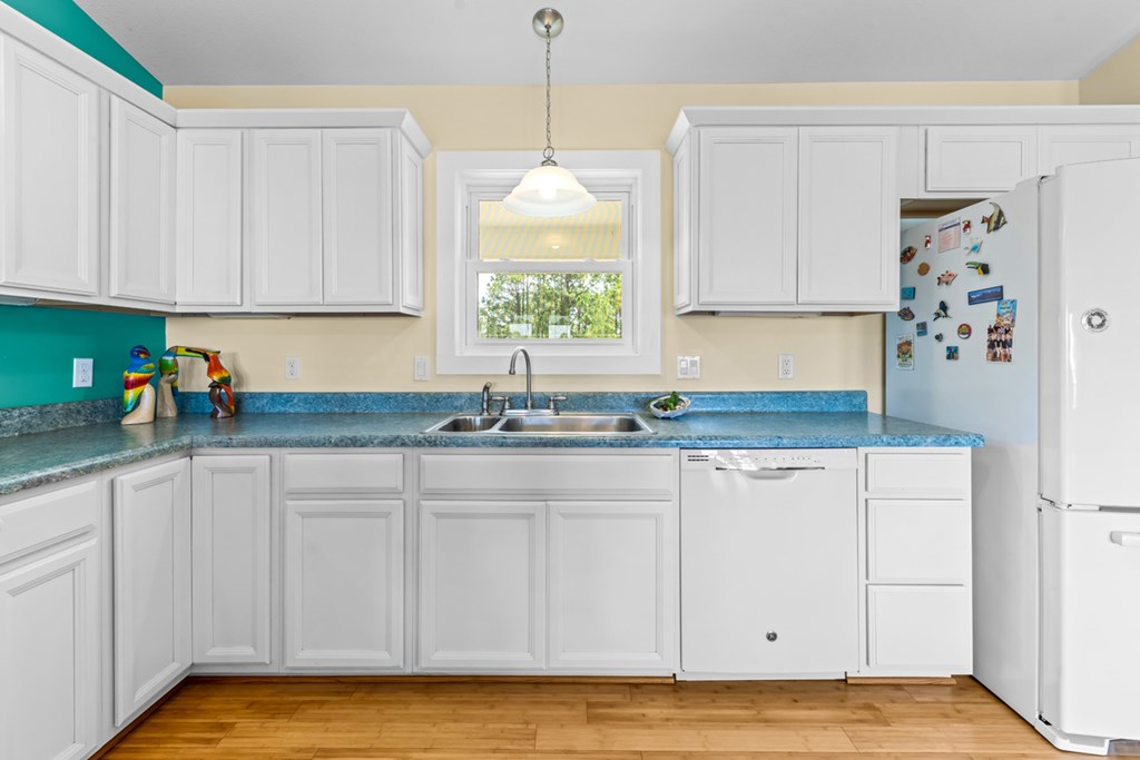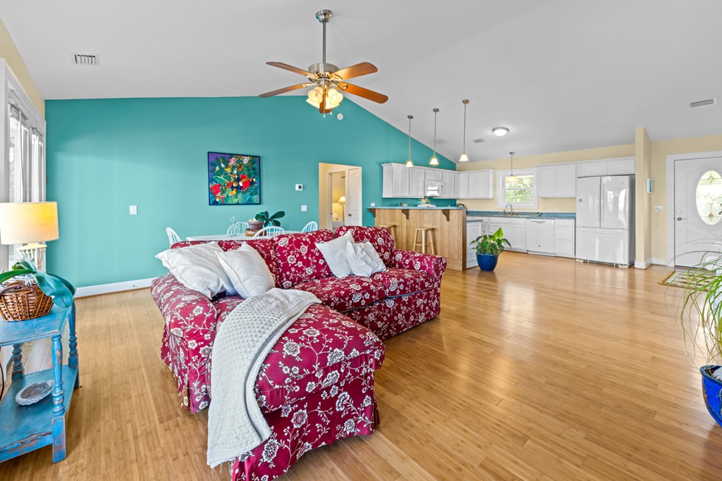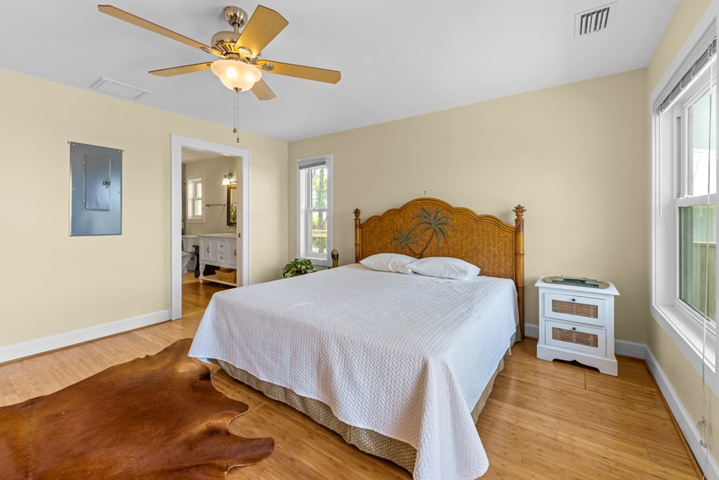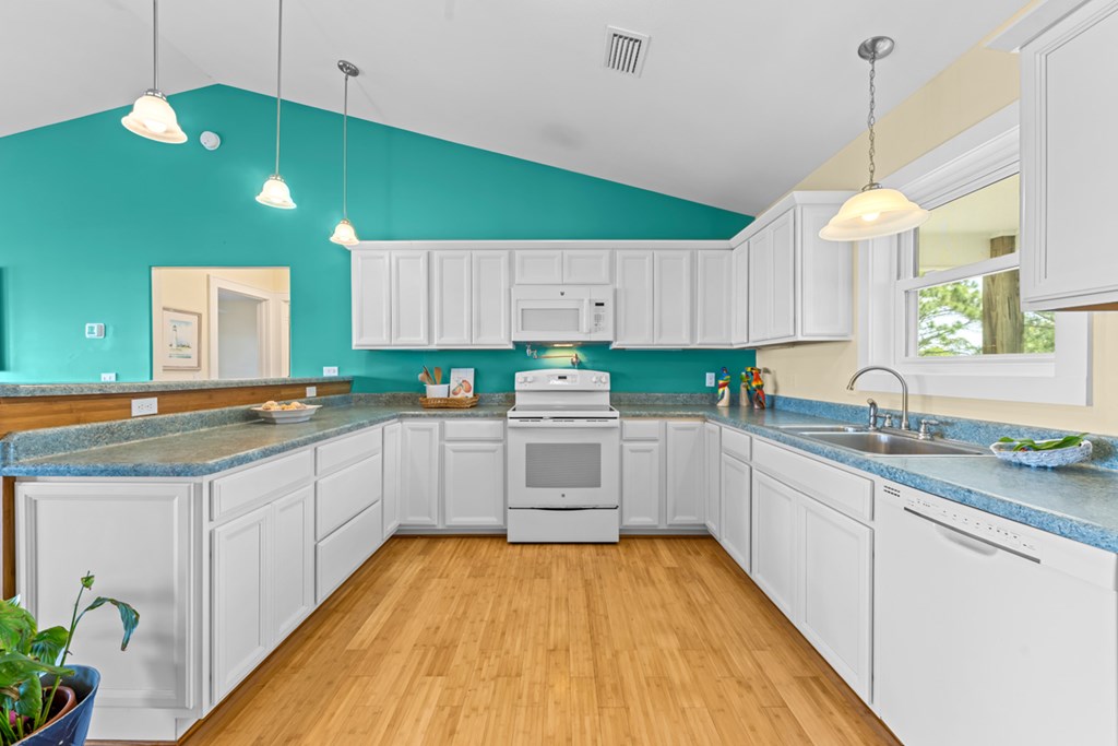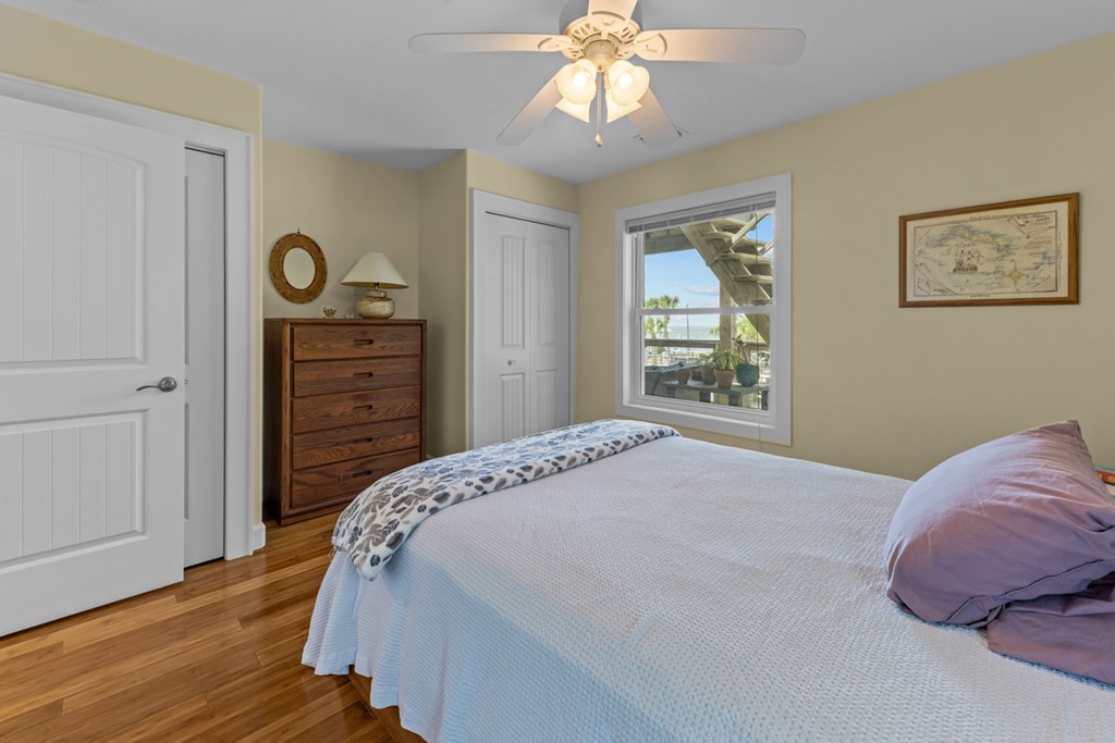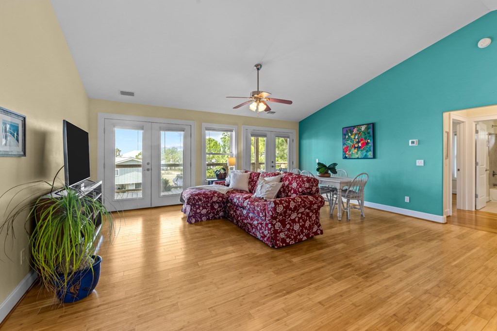 Wake up to sweeping bay views in this beautifully designed 3 bedroom, 2 bathroom coastal retreat near the heart of St. George Island, Florida. Perfectly positioned on a nice interior lot and built on cement pilings, this thoughtfully designed home captures sweeping, forever views of the Apalachicola Bay, with a top deck vantage point that stretches all the way to the Apalachicola River. Designed with both comfort and entertaining in mind, the open concept layout features high vaulted ceilings, rich bamboo flooring throughout, and a spacious breakfast bar that invites gathering. The kitchen and living areas flow seamlessly onto expansive porches where coastal breezes, glowing sunsets, and star filled skies set the tone for effortless indoor-outdoor living. Enjoy incredible water views from the crows nest and ample room for activities on the parking deck! The primary suite offers a peaceful escape with a large bedroom, walk in closet, and beautifully appointed tile shower, while two additional guest bedrooms are generously sized with ample closet space and natural light. Every detail reflects quality craftsmanship and a warm, welcoming energy. Located just moments from the beach and extremely close to the coveted, Regatta Park, this golf cart friendly neighborhood offers easy access to downtown island charm, white sand beaches, and the laid back lifestyle of the Forgotten Coast. Enjoy nearby dining, shops, and a short scenic drive to historic Apalachicola. Additional highlights include under house space tall enough to accommodate a large boat, making it ideal for those who want to fully embrace coastal living on and off the water. Whether you are searching for a full time residence, second home, or investment rental, this property delivers on location, lifestyle, and value. Priced to sell, this is a rare opportunity to own a home that truly captures the spirit and the views of the Forgotten Coast. No HOA! Offered furnished with all the island vibes!