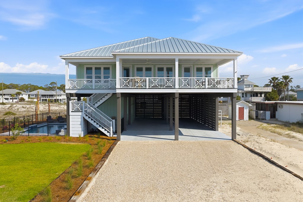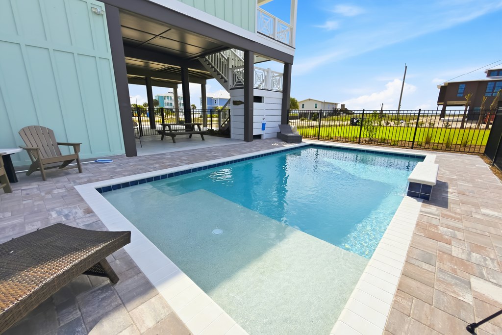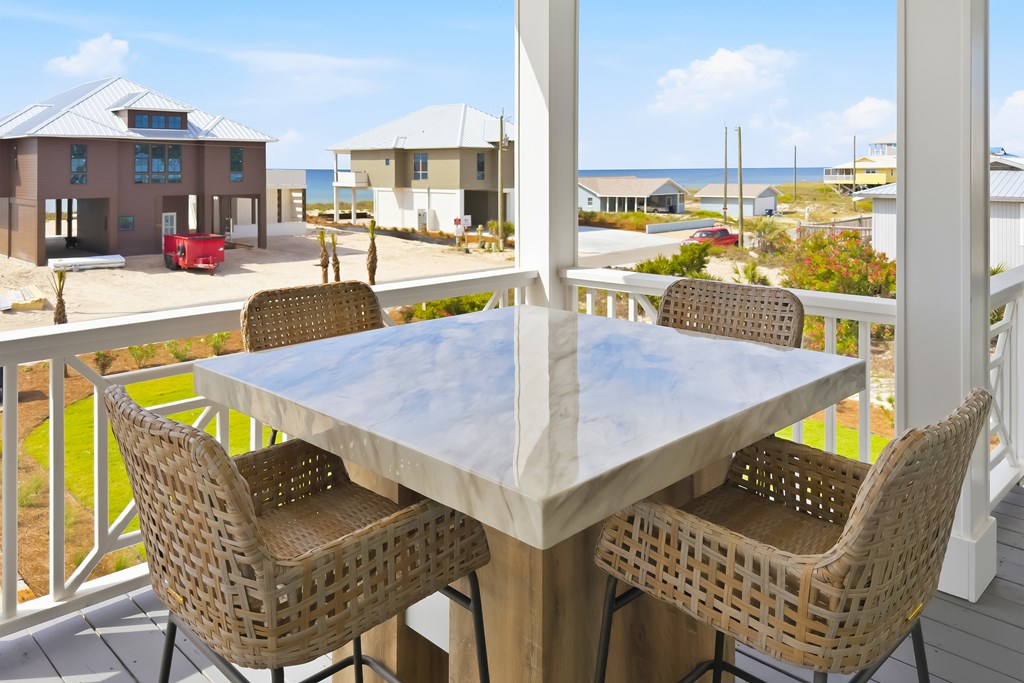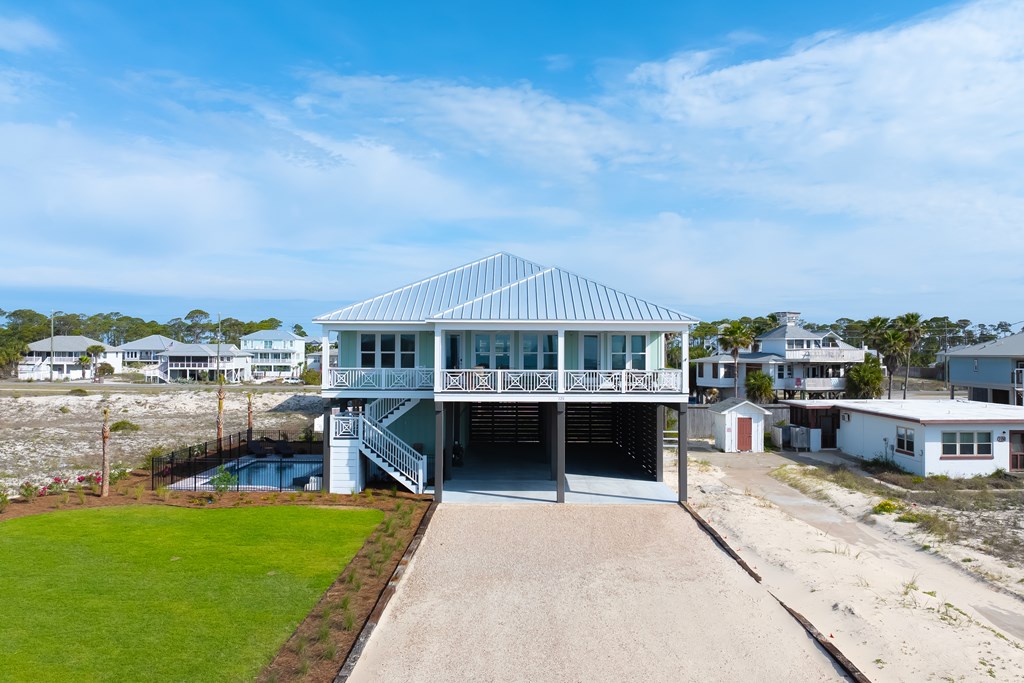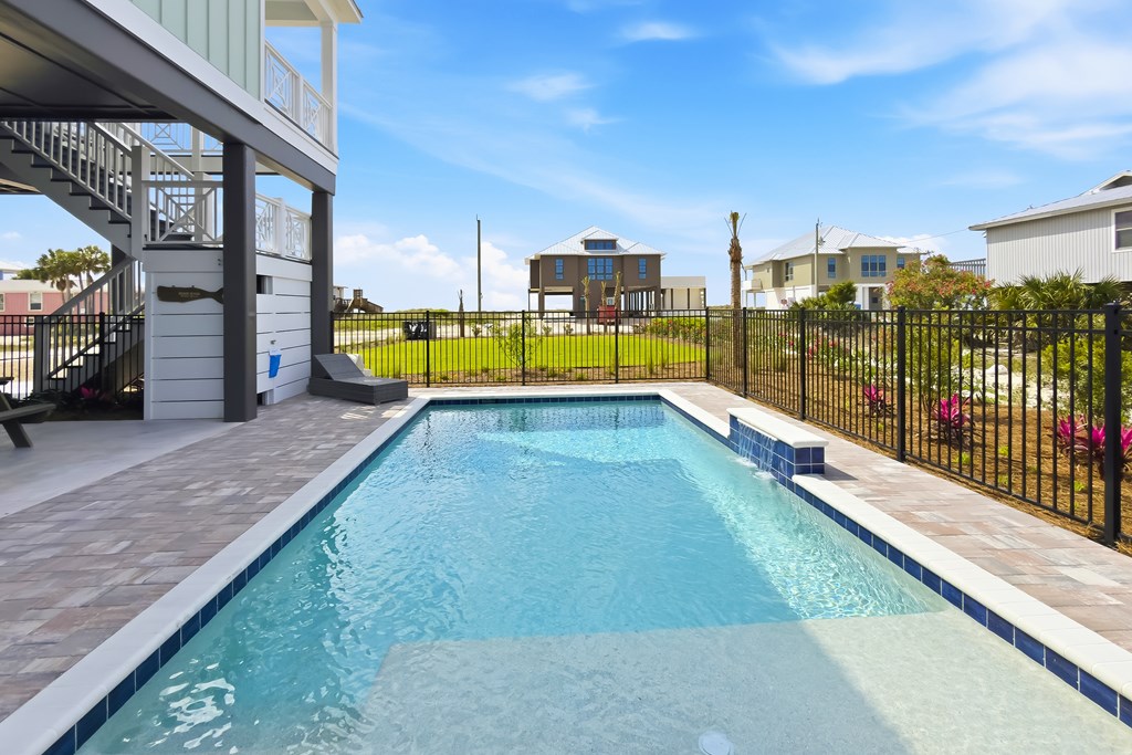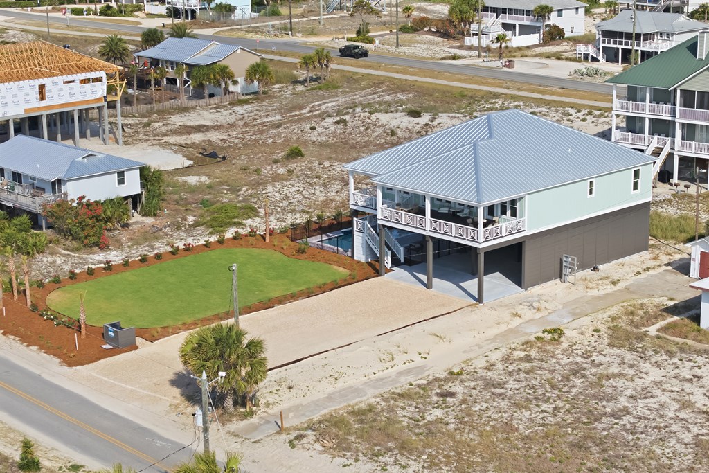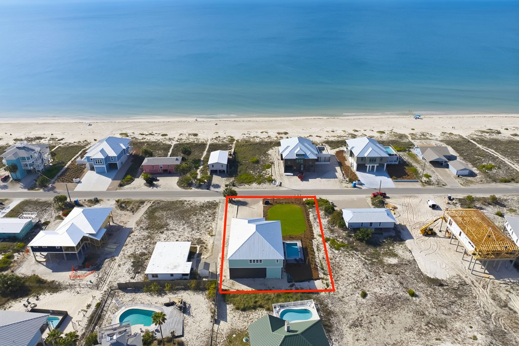 Beautiful new construction beach house in the desirable Gulf Beaches area, perfectly positioned just across the street from the beach. This 4-bedroom, 4-bath home offers stunning beach views from the expansive 640-square-foot furnished deck, designed for relaxing, entertaining, and enjoying the coastal breeze. Inside, the thoughtfully designed split floor plan features a spacious great room. The home features 9-foot interior ceilings, creating an open and airy feel throughout. The large kitchen offers abundant cabinet space, granite countertops, stainless steel appliances, and an open flow into the main living and dining areas. Luxury vinyl plank flooring, crown molding, shiplap accent walls, solid wood interior doors, and beautifully selected dcor create a warm yet refined coastal atmosphere. Three of the four bedrooms feature private ensuite bathrooms, offering comfort and privacy for guests and owners alike. Large windows throughout the home fill the interior with natural light, while the oversized laundry room provides excellent space for additional storage. Outdoor living is just as impressive with a professionally landscaped and maintained yard, custom wood deck railings, a wide exterior staircase, enclosed outdoor shower, and a stunning 26' x 13' Gunite pool complete with a sun shelf. The brick pool deck and patio area create the perfect oasis for sunbathing and entertaining. Additional features include an elevator for convenience and a garage/storage area under the home, ideal for your golf cart and beach gear. Located in the golf cart-friendly Gulf Beaches community, this home is close to the bike path and just over a mile from groceries, gas, shops, and restaurants—offering the perfect blend of luxury, comfort, and island convenience. Construction was completed early 2026 and new to the vacation rental market.