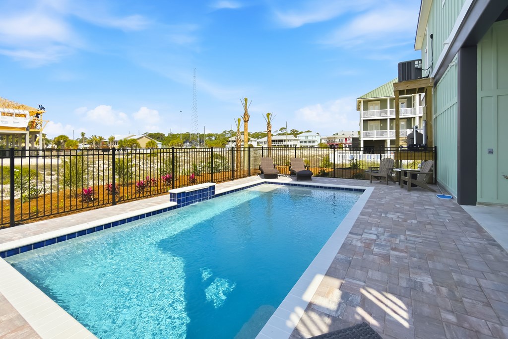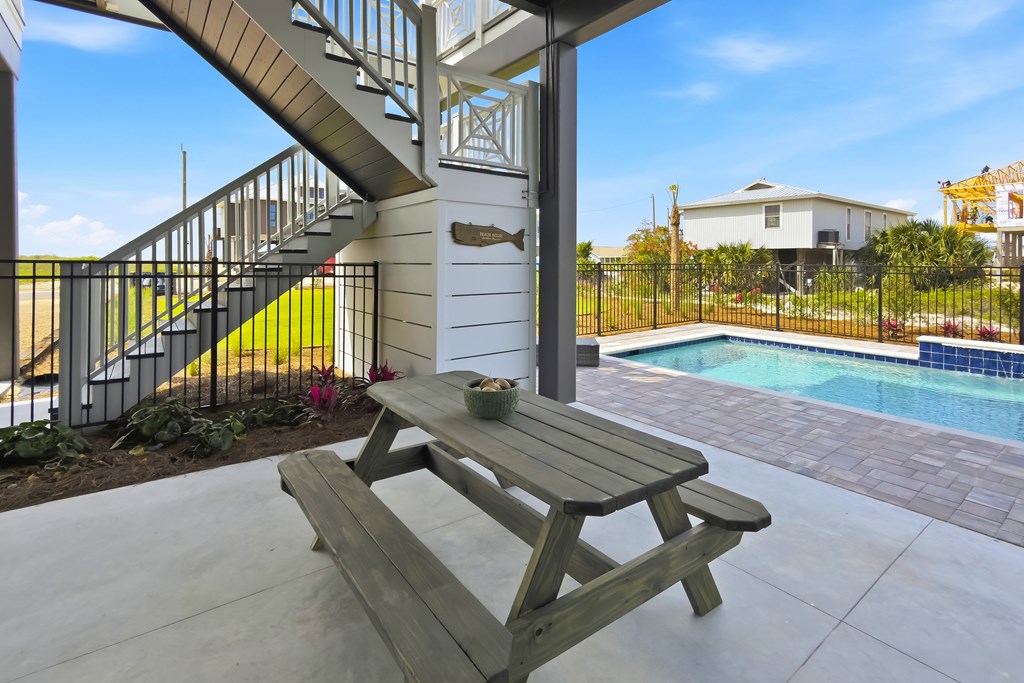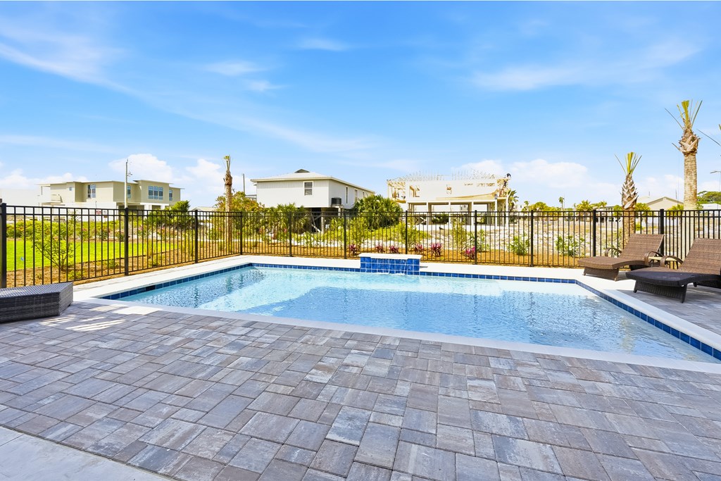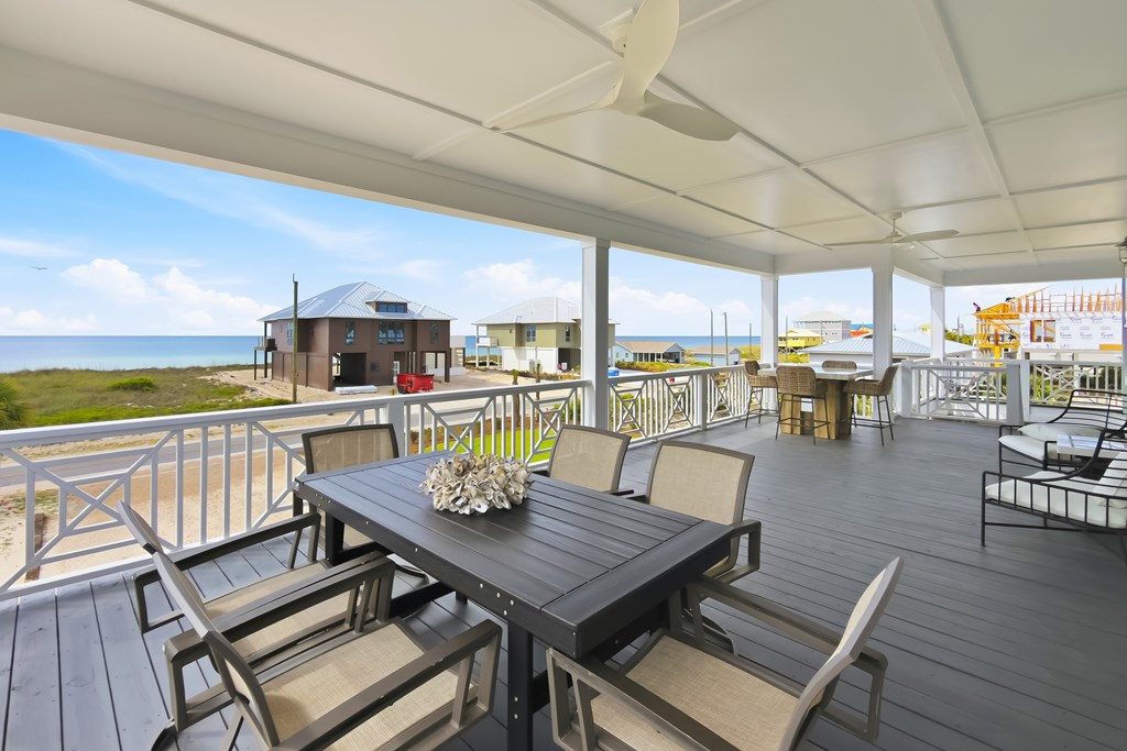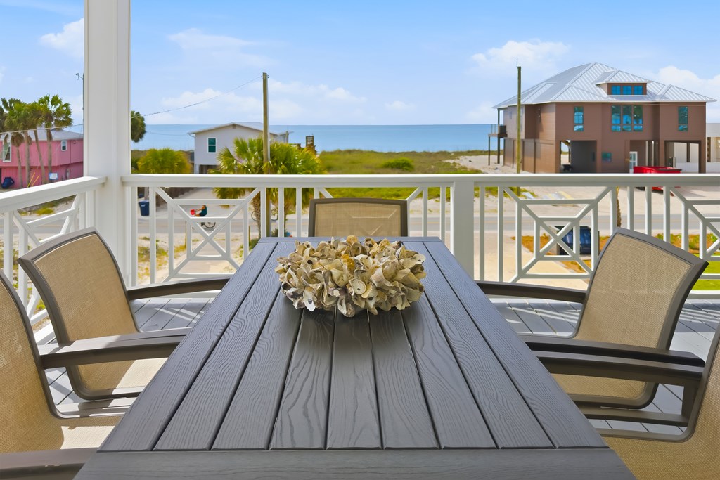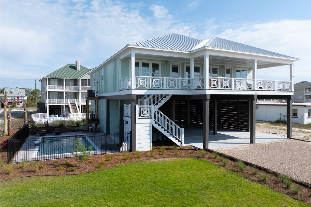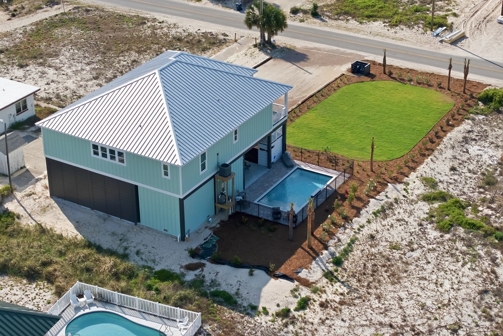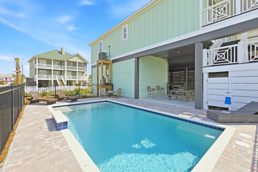 Beautiful new construction beach house in the desirable Gulf Beaches area, perfectly positioned just across the street from the beach. This 4-bedroom, 4-bath home offers stunning beach views from the expansive 640-square-foot furnished deck, designed for relaxing, entertaining, and enjoying the coastal breeze. Inside, the thoughtfully designed split floor plan features a spacious great room. The home features 9-foot interior ceilings, creating an open and airy feel throughout. The large kitchen offers abundant cabinet space, granite countertops, stainless steel appliances, and an open flow into the main living and dining areas. Luxury vinyl plank flooring, crown molding, shiplap accent walls, solid wood interior doors, and beautifully selected dcor create a warm yet refined coastal atmosphere. Three of the four bedrooms feature private ensuite bathrooms, offering comfort and privacy for guests and owners alike. Large windows throughout the home fill the interior with natural light, while the oversized laundry room provides excellent space for additional storage. Outdoor living is just as impressive with a professionally landscaped and maintained yard, custom wood deck railings, a wide exterior staircase, enclosed outdoor shower, and a stunning 26' x 13' Gunite pool complete with a sun shelf. The brick pool deck and patio area create the perfect oasis for sunbathing and entertaining. Additional features include an elevator for convenience and a garage/storage area under the home, ideal for your golf cart and beach gear. Located in the golf cart-friendly Gulf Beaches community, this home is close to the bike path and just over a mile from groceries, gas, shops, and restaurants—offering the perfect blend of luxury, comfort, and island convenience. Construction was completed early 2026 and new to the vacation rental market.