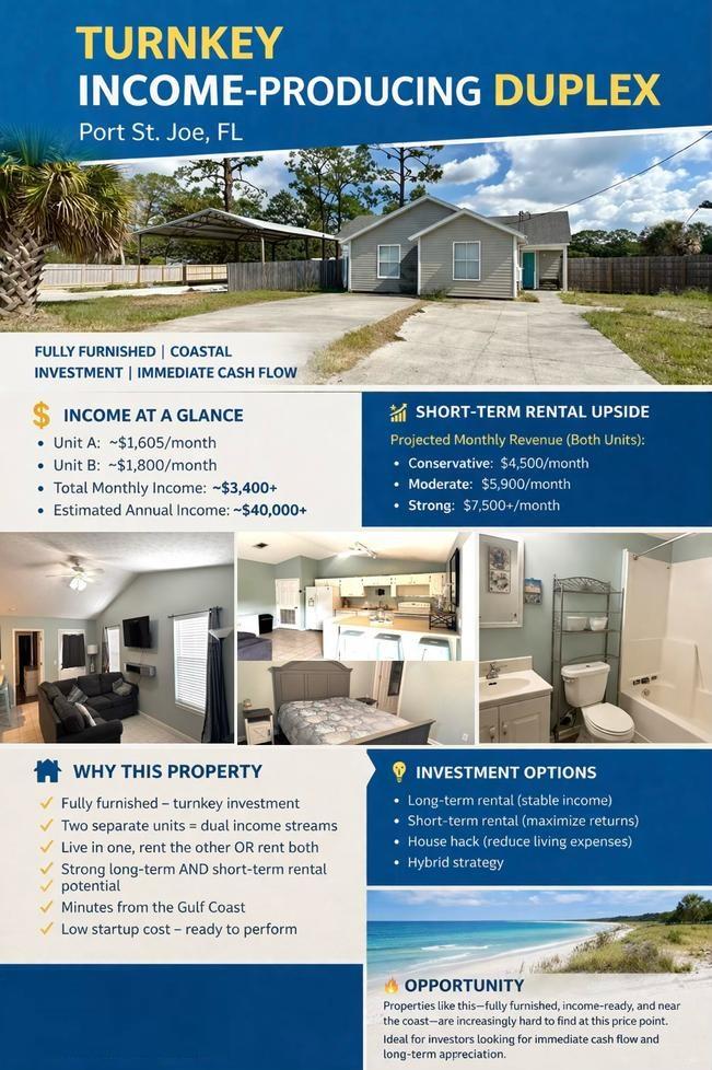 Immediate cash-flow opportunity—fully furnished duplex generating $3,400+/month with additional short-term rental upside. This fully furnished duplex offers a rare opportunity to own a turnkey, income-producing property in the growing Port St. Joe market. Whether you're looking for immediate cash flow, a short-term rental opportunity, or a house-hack setup, this property is ready to perform from day one. Each unit features its own private living space, allowing for multiple income strategies. Rent both units for maximum cash flow, live in one side while the other offsets your expenses, or explore short-term rental potential for even higher returns (buyer to verify local regulations). Estimated long-term rental income is approximately $1,605/month on one unit and $1,800/month on the other, for a combined total of over $3,400/month ($40,000+ annually). With the property being sold fully furnished, there is little to no startup cost—making it ideal for investors looking for a plug-and-play asset. The duplex layout provides separation and privacy, while the outdoor patio/deck area and fenced yard add additional appeal for both long-term tenants and short-term guests. Located just minutes from Port St. Joe and the Gulf Coast, this property benefits from strong rental demand driven by both local workforce needs and seasonal tourism. This is not just a property—it's a flexible income-producing asset with multiple exit strategies. Take a private tour: https://bit.ly/JonesHomestead