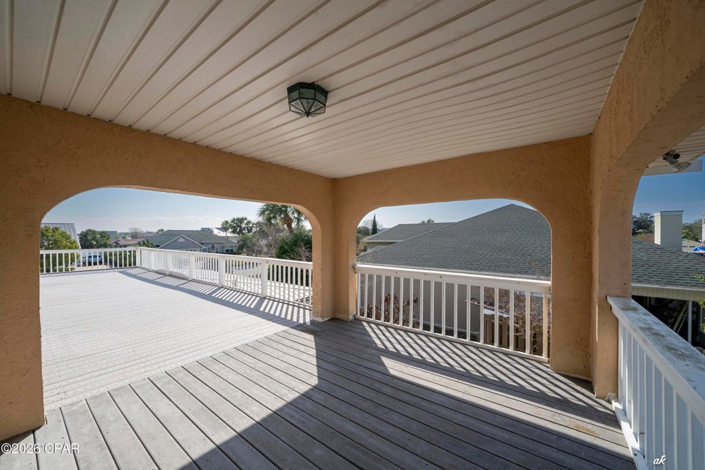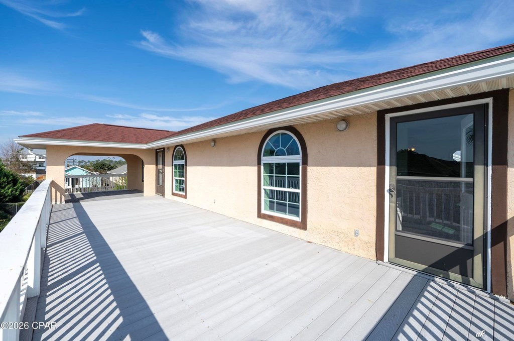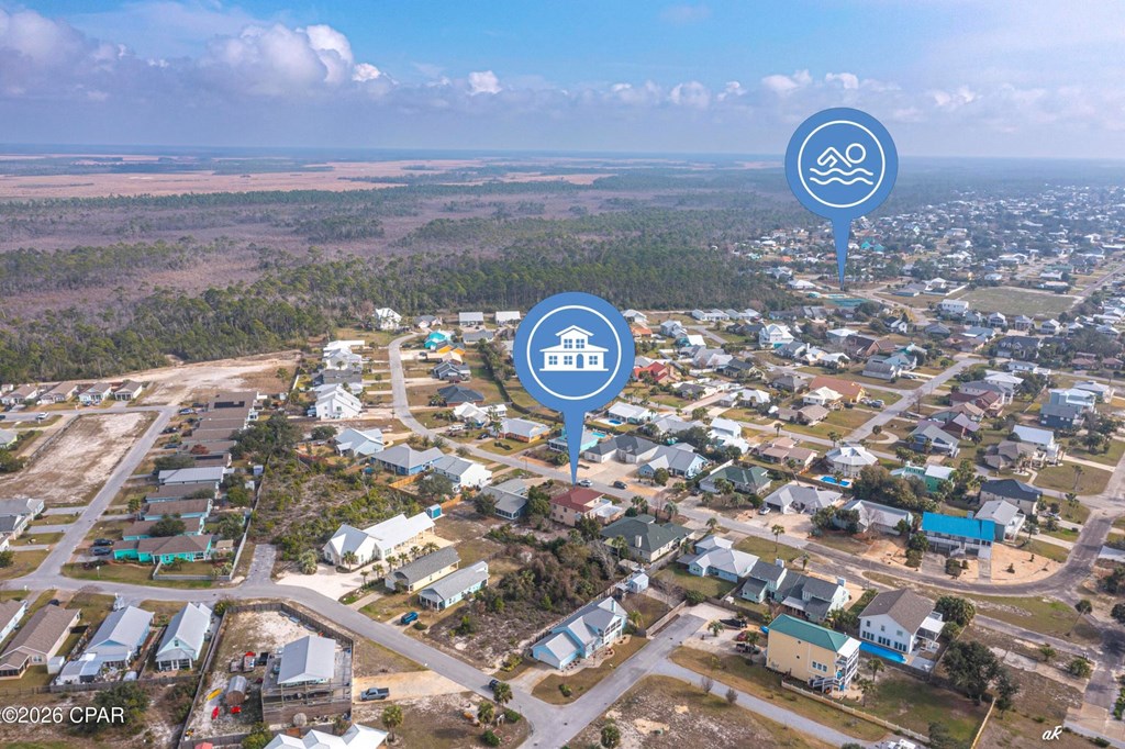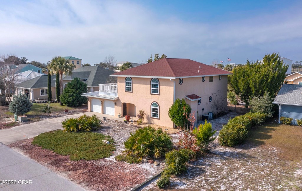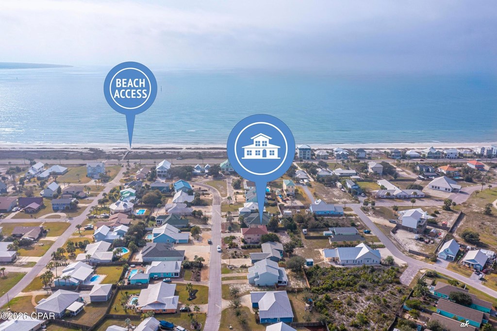 Beautifully positioned in the highly coveted Gulf Aire community of Port St. Joe, this elegant coastal residence offers the perfect blend of luxury, flexibility, and effortless seaside living, steps from the sugar-white sands and emerald waters of the Gulf of Mexico. Spanning 2,742 square feet, the home features 3 bedrooms and 3 bathrooms, with all bedrooms thoughtfully located upstairs to provide privacy and a true retreat-like feel, ideal for a second home or vacation escape. A spacious Florida room offers exceptional versatility and can easily be converted into a first-floor primary suite, complemented by a full bathroom on the main level, perfect for hosting guests or accommodating extended family. Set on an oversized quarter-acre lot, the expansive backyard provides ample space to add a pool and create a private outdoor oasis for relaxing or entertaining after a day at the beach. The upstairs primary bath features a double vanity and walk-in shower, while a balcony spanning the length of the home enhances the coastal ambiance. Located in the heart of Port St. Joe, this exceptional property presents endless possibilities as a refined second home in one of the area's most desirable Gulf-front communities. Amenities include private beach access, a community pool, and Pickleball courts.