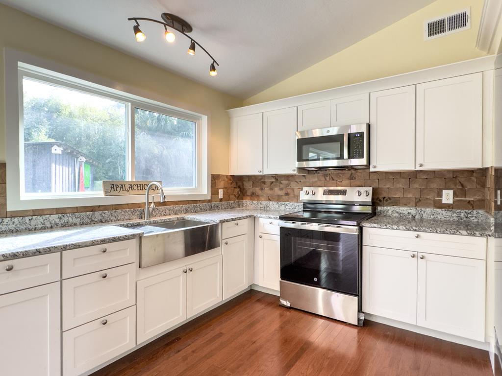 Totally renovated modern kitchen welcomes morning sun in this tastefully upgraded move-in ready cozy 1950's bayside 2BR/2BA cottage in quiet neighborhood just outside historic district. New paint, new hardwood flooring throughout, all new windows, all new fixture modern bathrooms. Vaulted ceiling highlights the living area. New hardiboard maintenance-free exterior siding. Native trees and shrubs provide backyard privacy. 10x20' metal yard utility building. Covered concrete driveway 12x20' RV/boat pad. Mickey Mantle could hit home run ball into Apalachicola Bay from the backyard.
